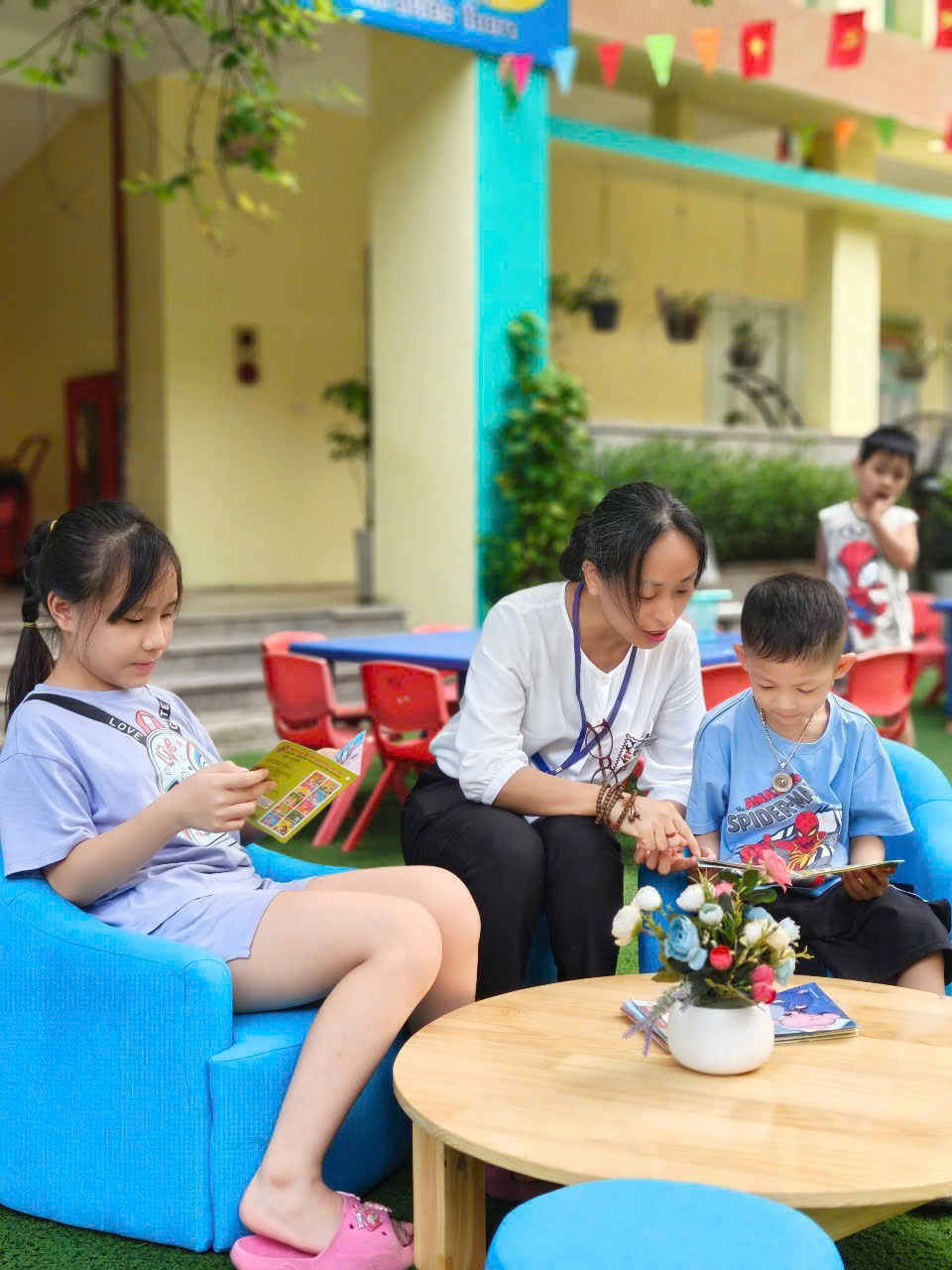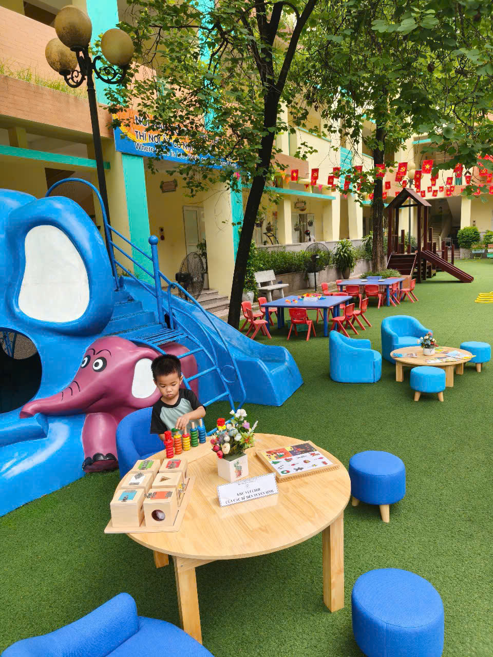 Ngay từ sáng sớm, sân trường đã tràn ngập ánh nắng cùng sắc màu tươi vui của cây và hoa sân trường  hòa trong tiếng nhạc vui nhộn cùng tiếng cười ròn rã của các bé học sinh. Các cô giáo ai ai cũng nở nụ cười tươi chào đón các bé với vòng tay rộng mở, giúp các bé nhanh chóng làm quen với môi trường mới.